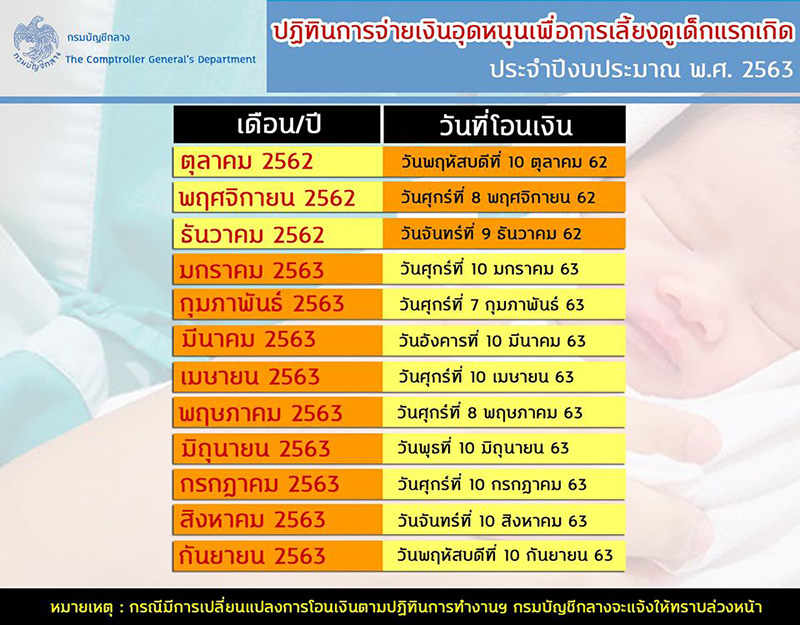 โครงการเงนอดหนนเพอการเลยงดเดกแรกเกด เผยปฏทนการจาย เงนอดหนนเดกแรกเกด ป 2564-2565 โอนเงนเขาบญชผปกครองวนไหน. เงนอดหนนบตร รอบเดอนมถนายน 2563. โดยจะไดเงนอดหนนบตรแรกเกด จำนวน 600 บาทตอคน และตอเดอน ไปจนถง อาย 6 ขวบ จะออกใหทกวนท 10 ของ.